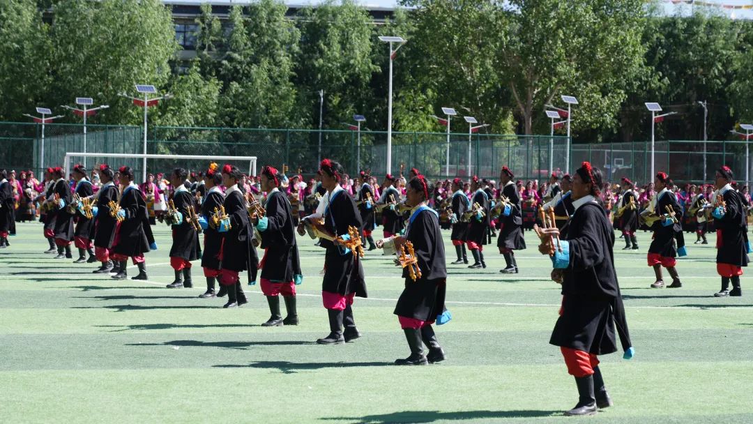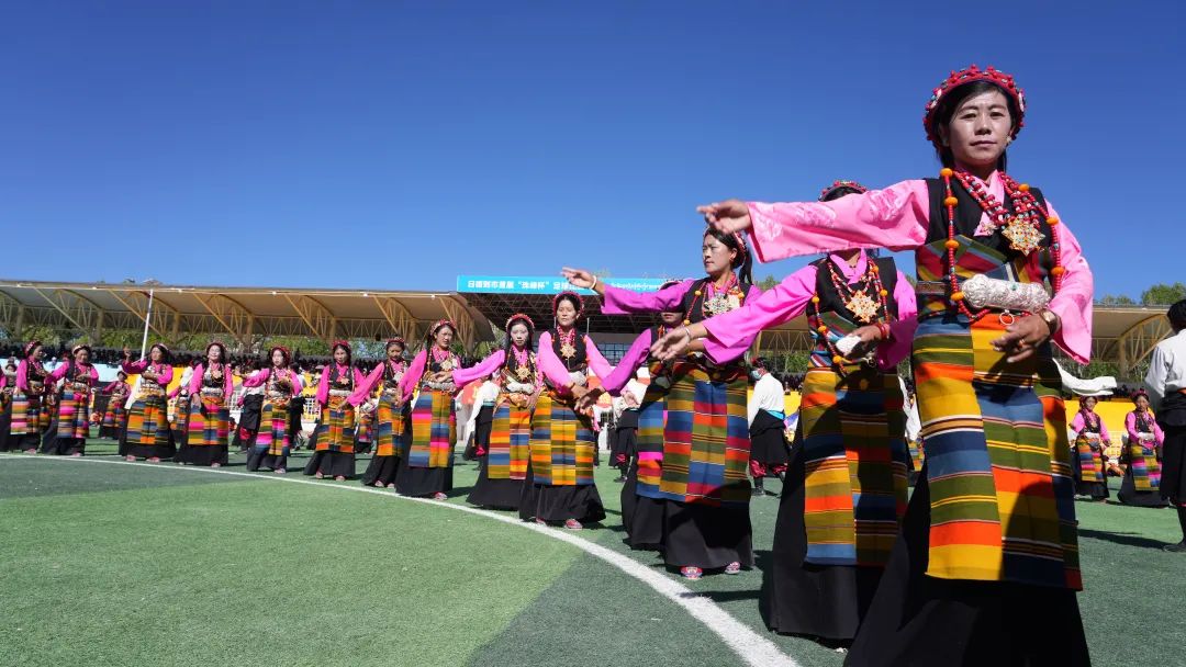 6月25日上午,主題為“相約珠峰·千人弦音”日喀則大型非遺歌舞展演在西藏自治區(qū)日喀則市上海體育場震撼上演?,F(xiàn)場共1000名參與者同時(shí)表演日喀則非遺民俗舞蹈。