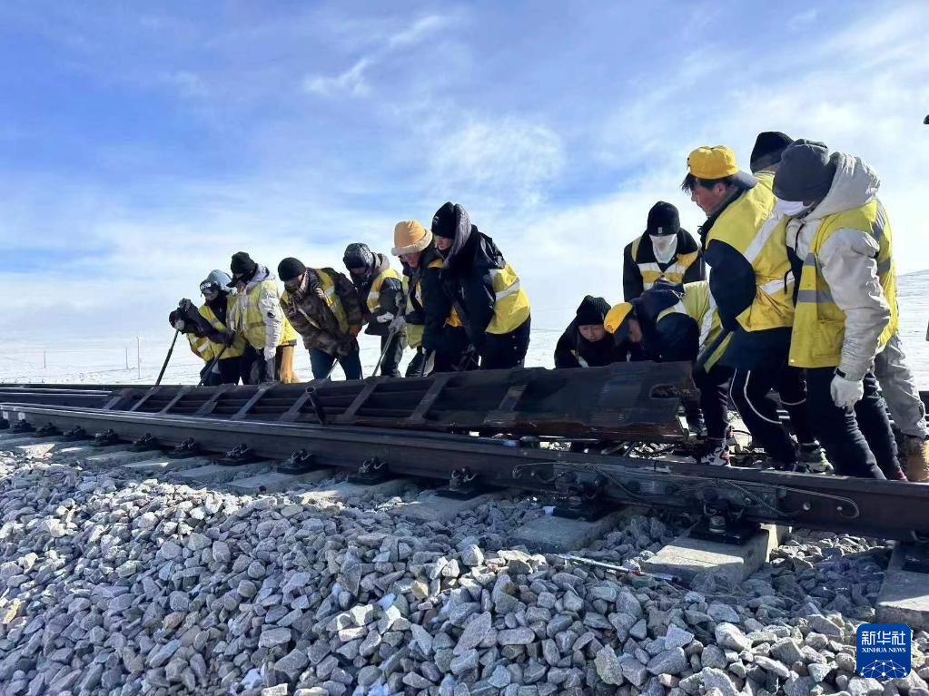 中鐵十二局集團(tuán)鐵路養(yǎng)護(hù)工程有限公司安多車(chē)間養(yǎng)護(hù)者進(jìn)行鐵路軌道養(yǎng)護(hù)作業(yè)。受訪者供圖