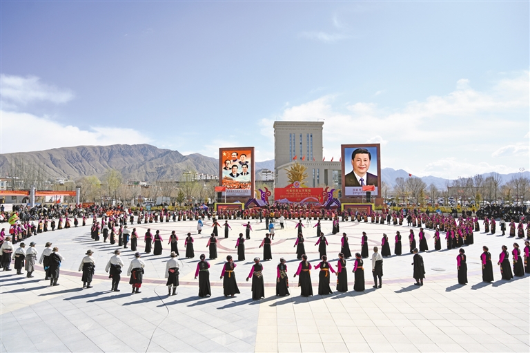 圖為日喀則市紀念西藏百萬農(nóng)奴解放64周年群眾聯(lián)歡活動(3月28日攝)。 記者 扎西頓珠 攝