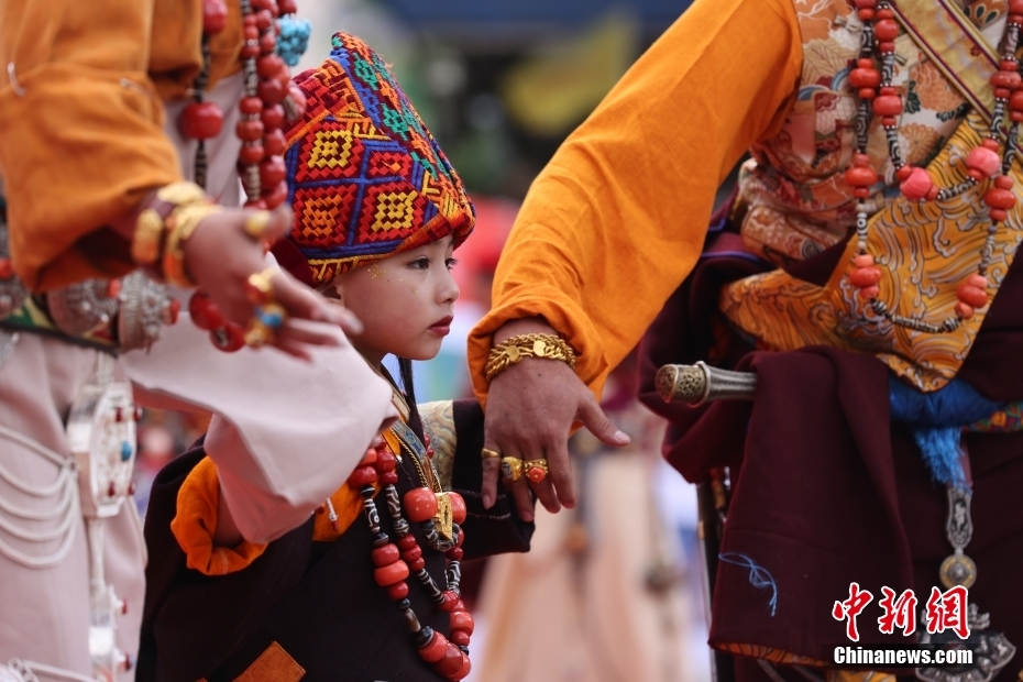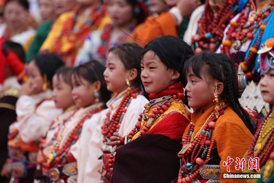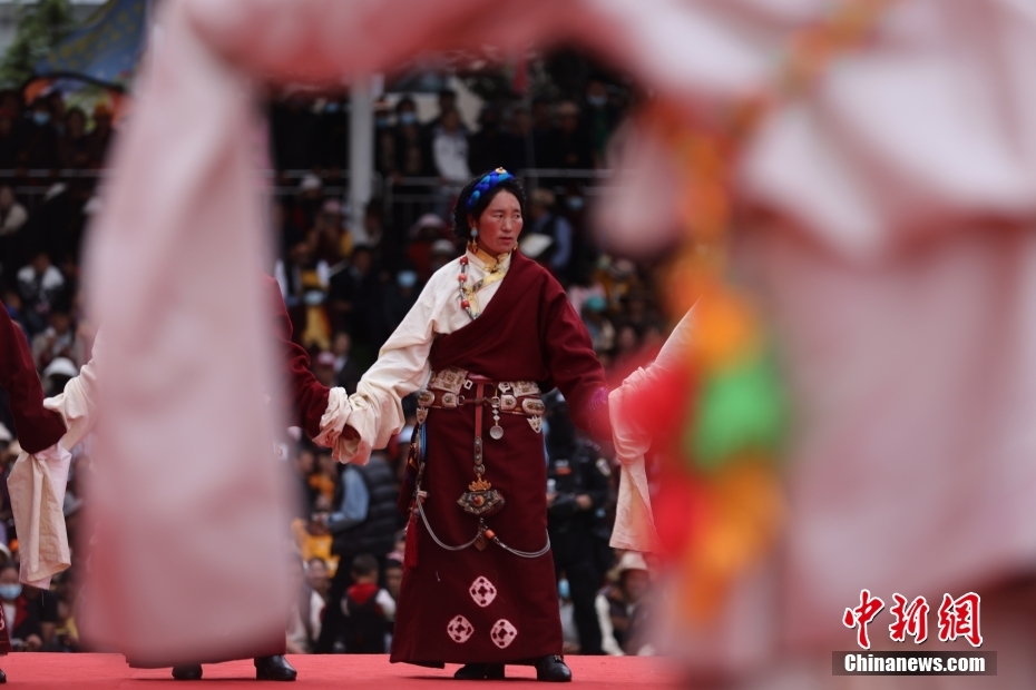 7月17日,西藏自治區(qū)昌都市貢覺縣,民眾身著極具特色的民族服裝服飾,載歌載舞出席當(dāng)?shù)氐奶厣椪够顒印?/p>
