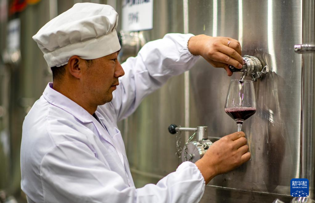 7月26日,桑日縣一家葡萄酒企業(yè)的釀酒師李曉平在發(fā)酵車間檢查酒樣。新華社記者 旦增尼瑪曲珠 攝