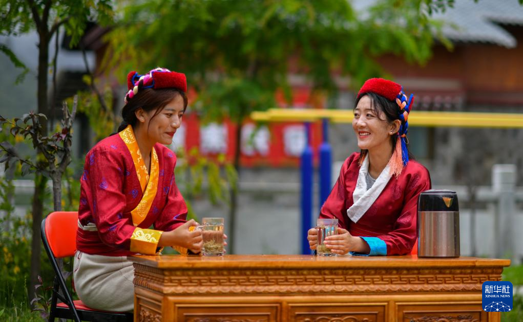 錯那市貢日門巴民族鄉(xiāng)斯木村第一書記尼瑪卓瑪(右一)在與村民一起品嘗莓茶(7月28日攝)。新華社記者 姜帆 攝