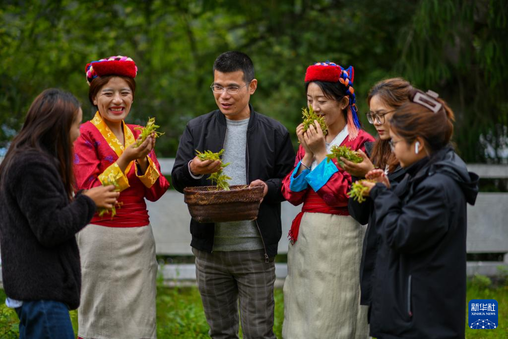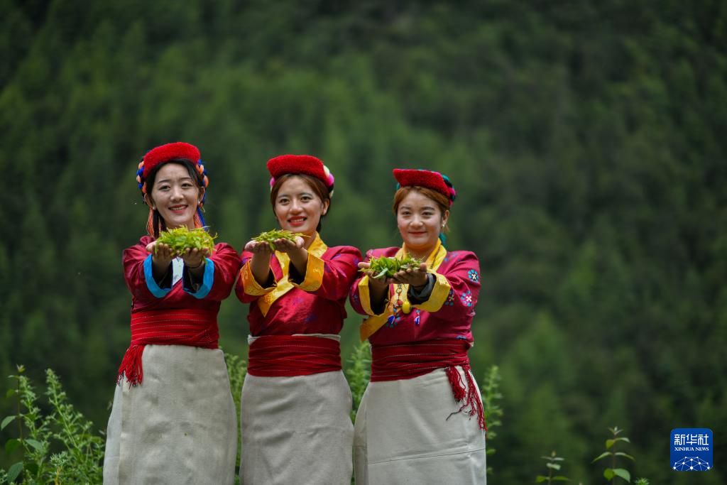 村民在采摘莓茶(7月28日攝)。新華社記者 旦增尼瑪曲珠 攝