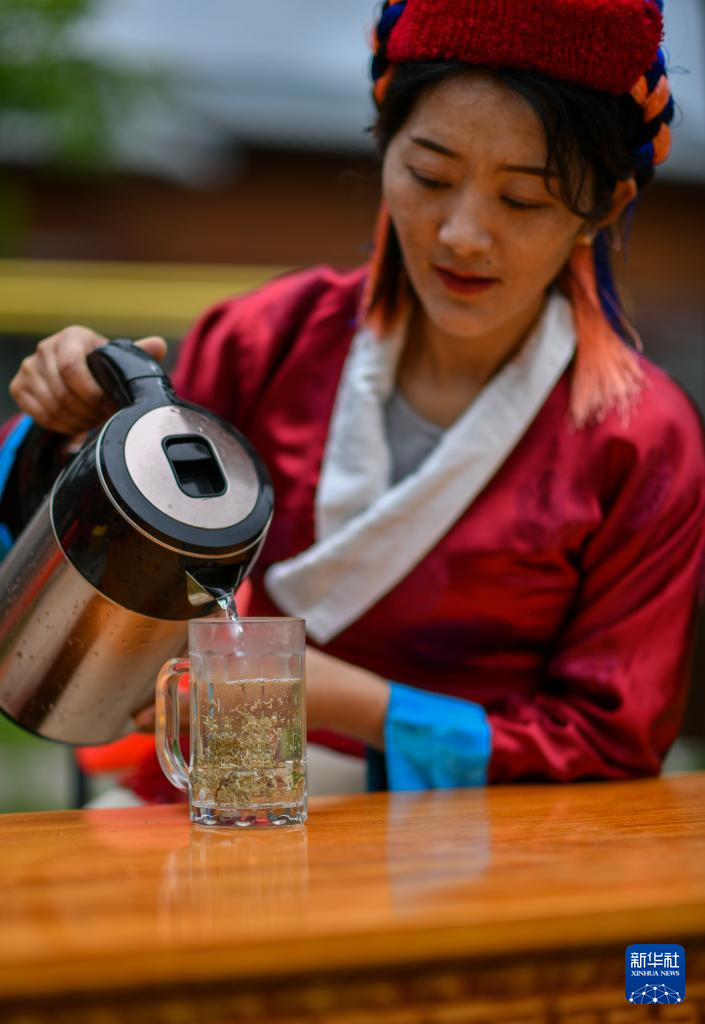 錯那市貢日門巴民族鄉(xiāng)斯木村第一書記尼瑪卓瑪在沏泡莓茶(7月28日攝)。新華社記者 姜帆 攝