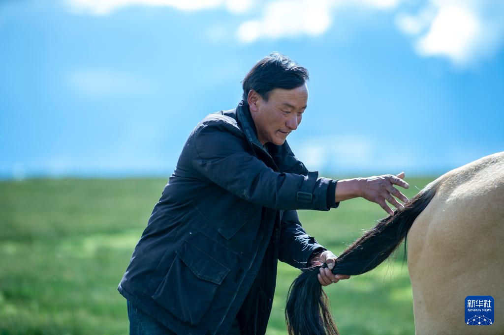 次扎達在給馬兒“隆達熱巴”喂食(8月9日攝)。新華社記者 陳澤鵬 攝