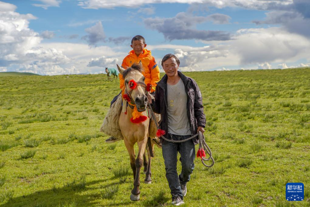 列熱覺旦騎著馬,他的父親次扎達牽著馬行走在草原上(8月9日攝)。新華社記者 邵澤東 攝