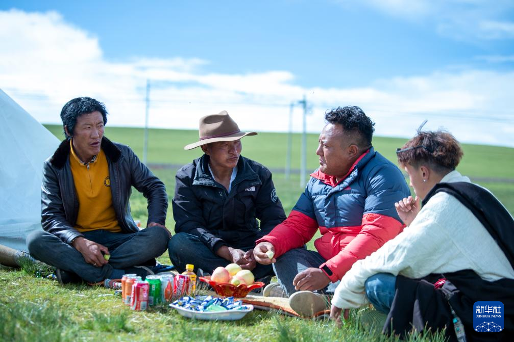 8月11日,次扎達(左二)和家人在草原上休息。新華社發(fā)(旦增努布攝)