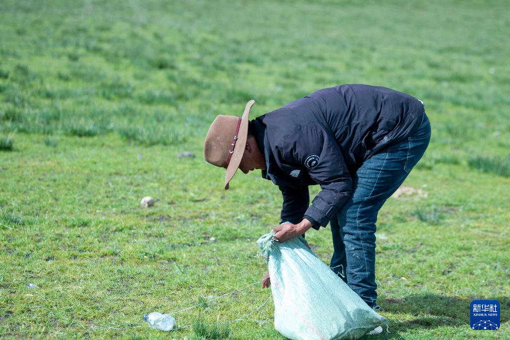 8月11日,次扎達在轉(zhuǎn)換牧場時撿拾生活垃圾。新華社發(fā)(旦增努布攝)