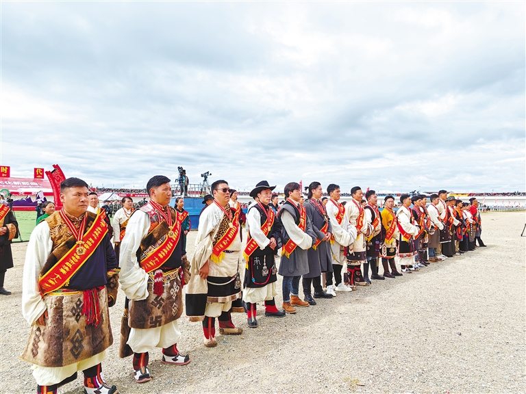 賽馬節(jié)期間,那曲市委、市政府對(duì)第二屆“鄉(xiāng)村振興 那曲奮進(jìn)”活動(dòng)市級(jí)決賽獲獎(jiǎng)群眾代表進(jìn)行隆重表彰。賽馬場(chǎng)內(nèi),男女老幼手捧哈達(dá)排起長(zhǎng)隊(duì),以草原人最熱烈喜慶的方式崇敬心中的“英雄”、歡送身邊的杰出勞動(dòng)者。