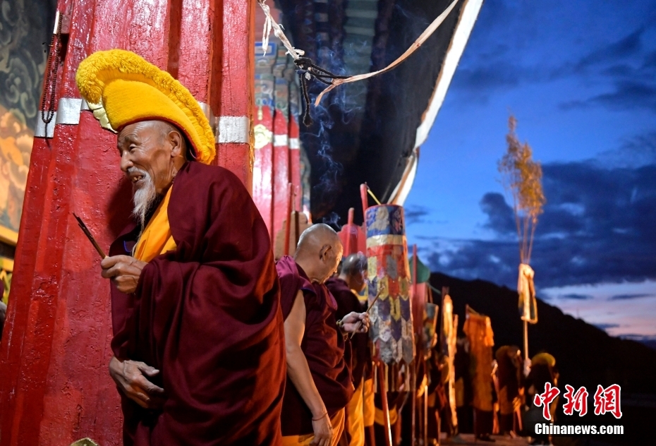 8月16日,拉薩哲蚌寺僧眾燃香為迎請?zhí)瓶ǖ年犖殚_道。