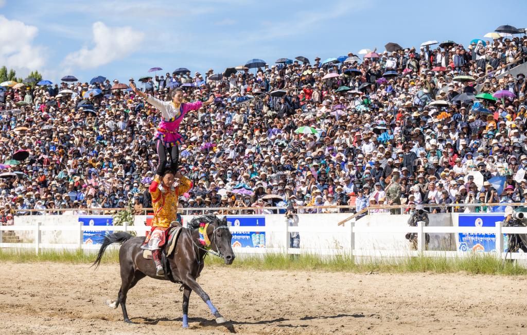 8月17日,2023拉薩雪頓節(jié)賽馬大會(huì)現(xiàn)場,兩位騎手正在進(jìn)行單馬雙人表演。新華社記者 丁增尼達(dá) 攝