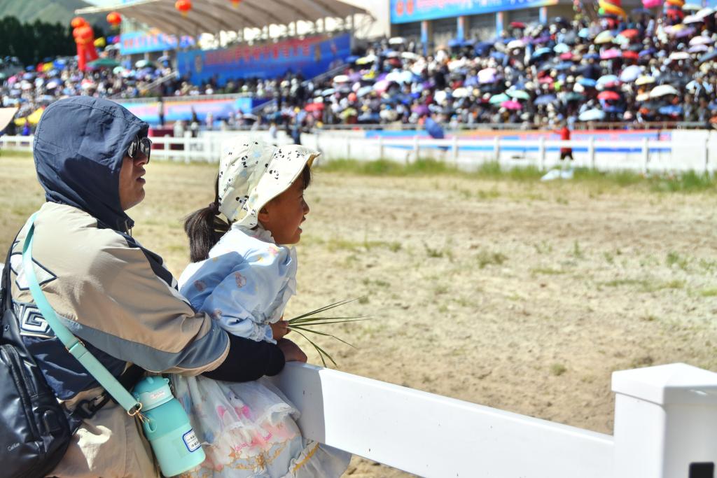 8月17日,2023拉薩雪頓節(jié)賽馬大會(huì)現(xiàn)場,一位父親帶著女兒來看比賽。新華社記者 劉文博 攝