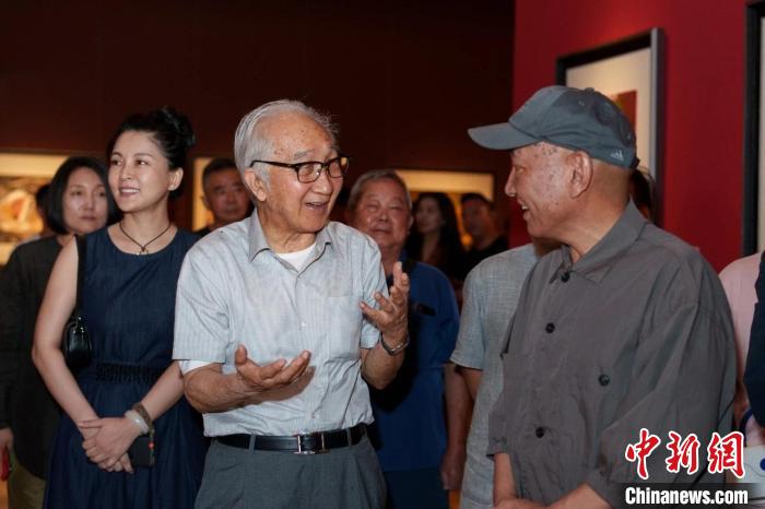 “藏色——巴瑪扎西畫展”亮相中國美術(shù)館,圖為中國美術(shù)家協(xié)會名譽(yù)主席、著名畫家靳尚誼(前排左一)與藏族畫家巴瑪扎西(右一)交流?!“椴匚幕﹫D