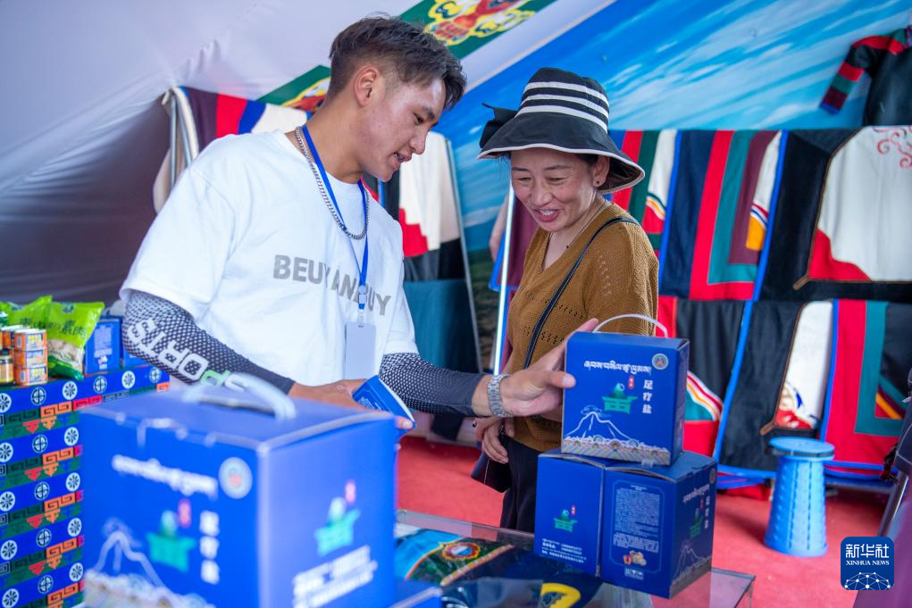 革吉縣鹽湖鄉(xiāng)羌麥村的村民旦真旺杰(左)在展銷會現場為顧客介紹產品(8月22日攝)。