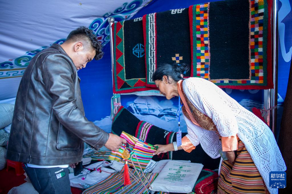普蘭縣細德村的村民次仁卓瑪(右)在展銷會上向顧客介紹產品。