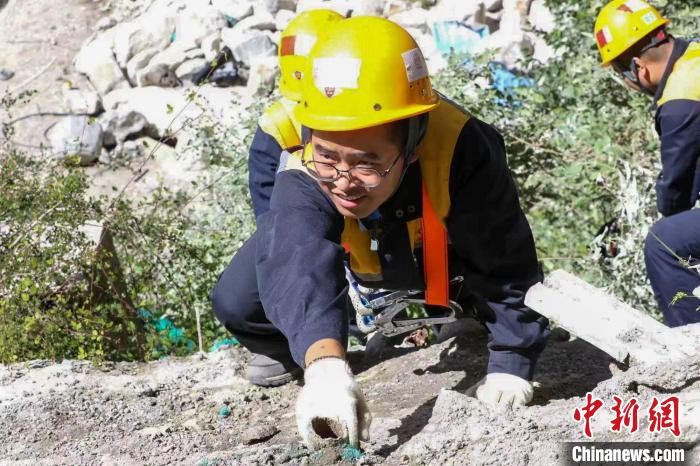 近日,在西藏山南雅魯藏布江畔的拉林鐵路安拉隧道口山崖上,中國鐵路青藏集團有限公司拉薩基礎(chǔ)設(shè)施段加查橋隧工區(qū)的職工們對山體開展巡視,他們一邊攀爬,一邊小心用手錘敲擊巖石,對有空虛、容易滑落的石塊用自噴漆進行標記。遠遠看去,一群人猶如壁虎穿梭于懸崖峭壁之上。