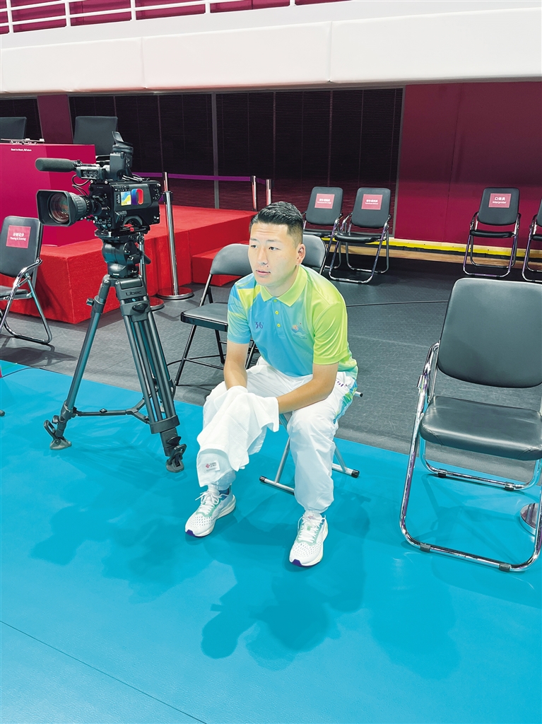 “‘快擦手’主要是在比賽期間手持毛巾,關(guān)注每一個球員的動作,一旦有球員為了救球滑倒在地上,我們要牢記這個位置,向裁判舉手示意,隨時需要以百米沖刺的速度沖上賽場、擦干地板,然后快速返回,避免其他失誤?!眮碜阅乔闹驹刚咴湍霞诱f。
