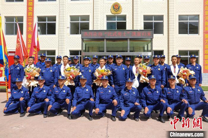 9月23日,參賽隊員載譽歸來,昌都市森林消防支隊熱烈歡迎參加比武指戰(zhàn)員載譽凱旋?!熬炊Y!”支隊指戰(zhàn)員用鮮花、哈達和熱烈的掌聲迎接凱旋歸來的勇士。