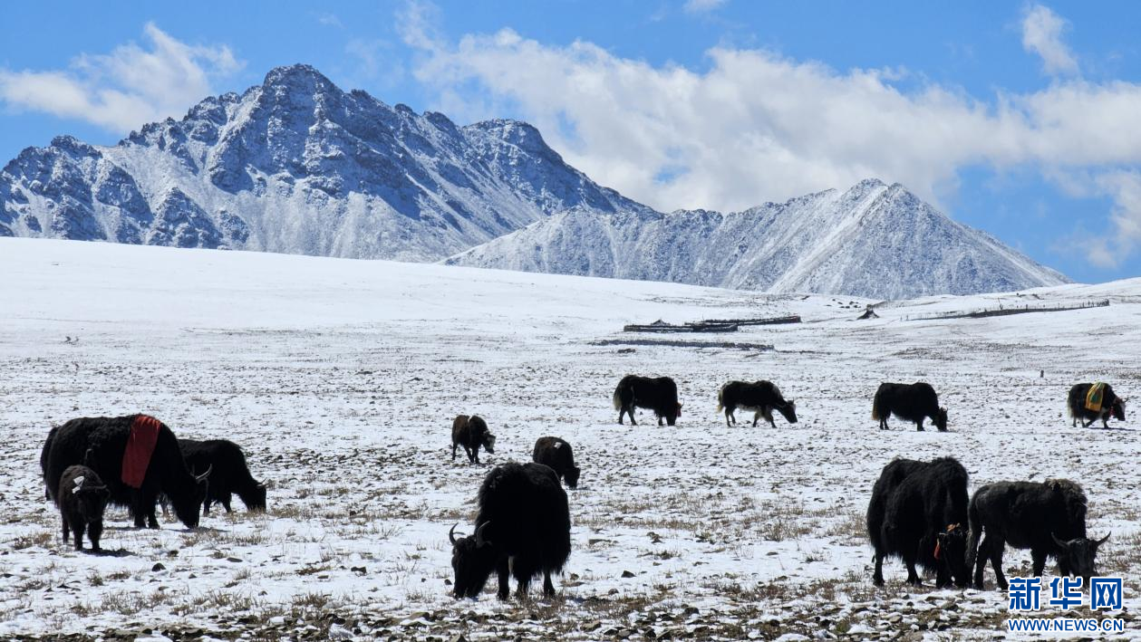 10月13日,在山南市措美縣境內(nèi)雪山腳下拍攝的牦牛。新華網(wǎng) 柑丹鴦琦 攝