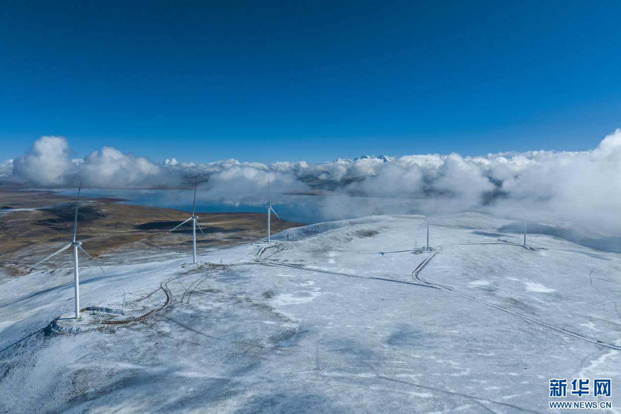 10月13日拍攝的西藏措美哲古風(fēng)電項目一處風(fēng)電機(jī)組(無人機(jī)照片)。新華網(wǎng) 旦增努布 攝