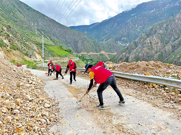 圖為芒康縣曲登鄉(xiāng)黨員開(kāi)展志愿服務(wù)活動(dòng),清理阻塞道路的落石。