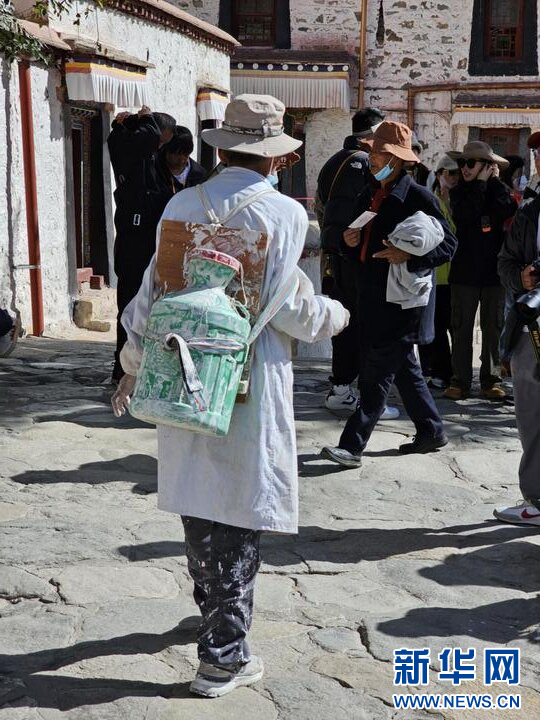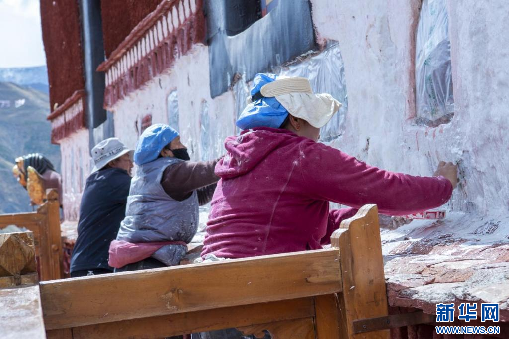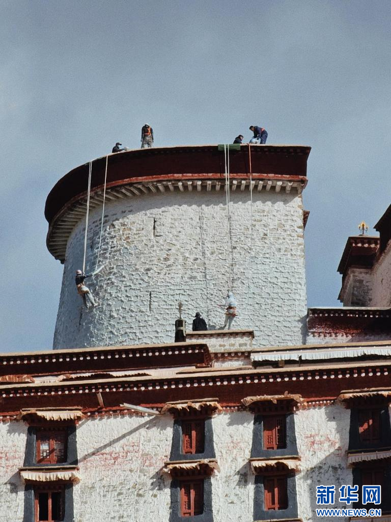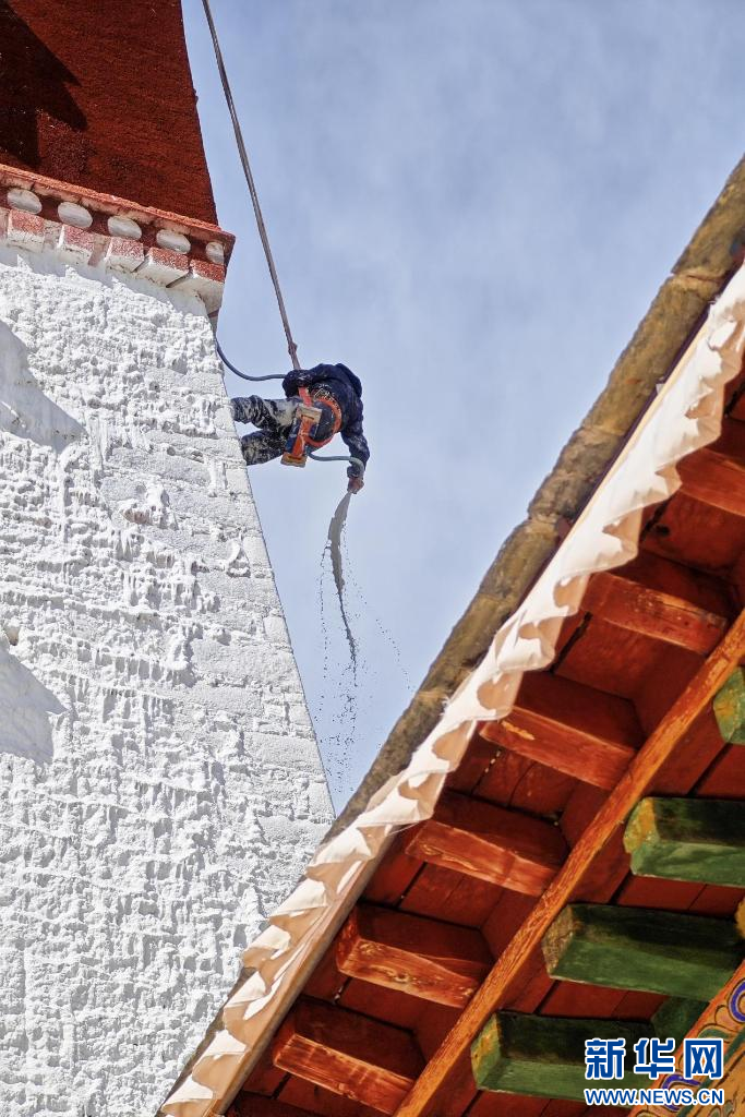 10月18日,布達(dá)拉宮“美容師”在噴灑涂料。新華網(wǎng) 柑丹鴦琦 攝