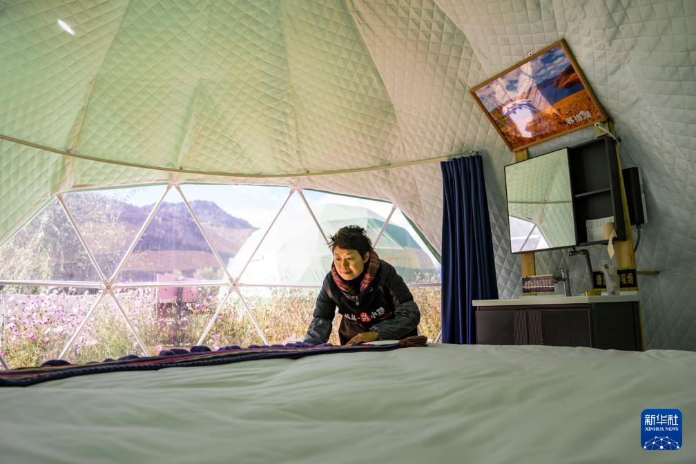 工作人員在西藏芒康縣如美鎮(zhèn)拉烏村一座星空帳篷內收拾床鋪(10月20日攝)。新華社記者 孫非 攝