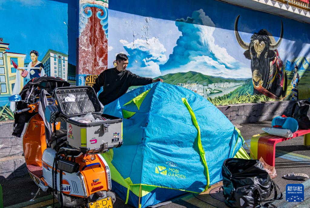 來自重慶的游客張靜在西藏芒康縣如美鎮(zhèn)拉烏村整理自己的帳篷(10月20日攝)。新華社記者 孫非 攝