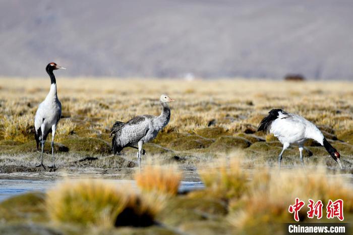 10月21日,黑頸鶴在西藏那曲市申扎縣買巴鄉(xiāng)附近的濕地覓食?!±盍?攝