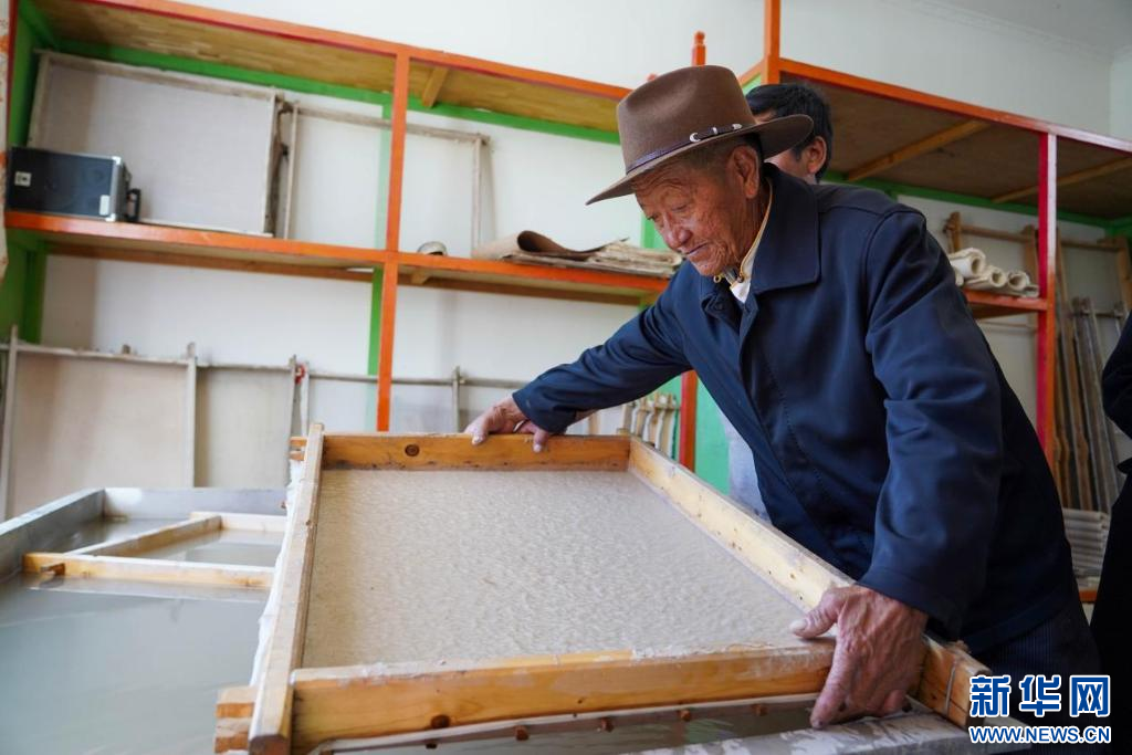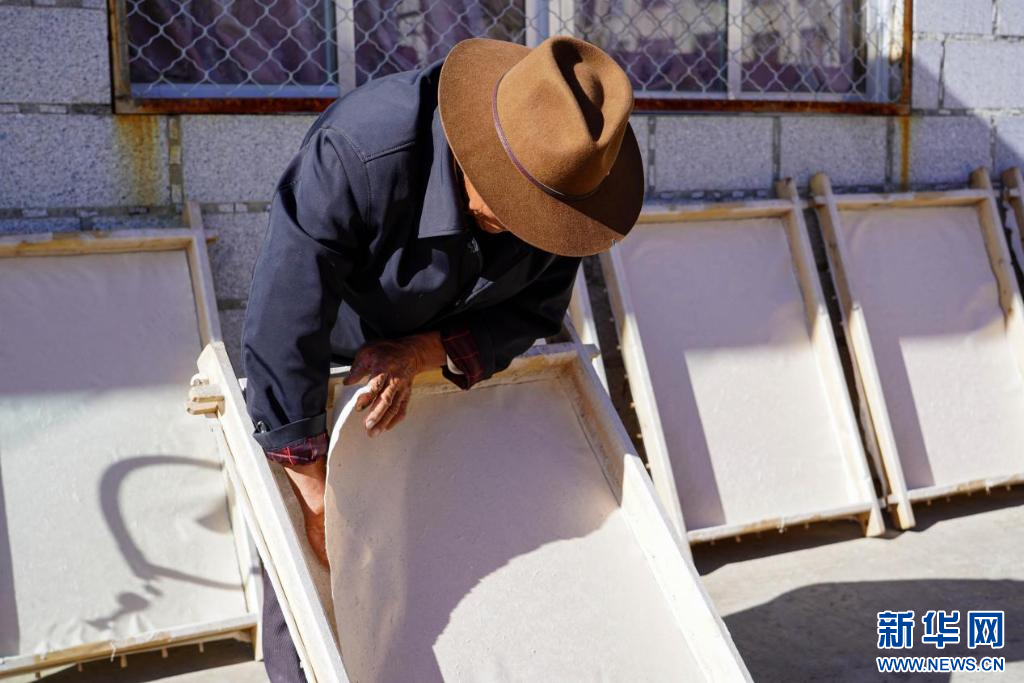 圖為次仁多杰進行澆造、抄紙工藝步驟(10月20日攝)。新華網(wǎng)發(fā) 司秦菱 攝