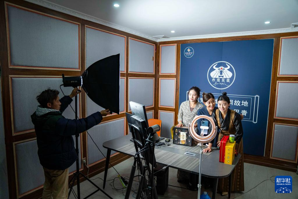網(wǎng)絡(luò)主播在巴青縣“赤堆東雄”網(wǎng)紅直播間推介當(dāng)?shù)靥厣r(nóng)牧產(chǎn)品(10月29日攝)。新華社記者 孫非 攝