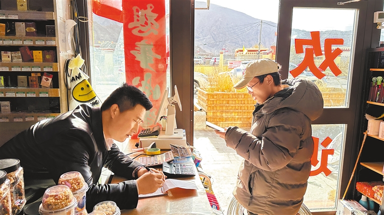 圖為多瑪鄉(xiāng)商戶劉世鵬(左)在為購物者結(jié)賬。記者 婁夢(mèng)琳 攝