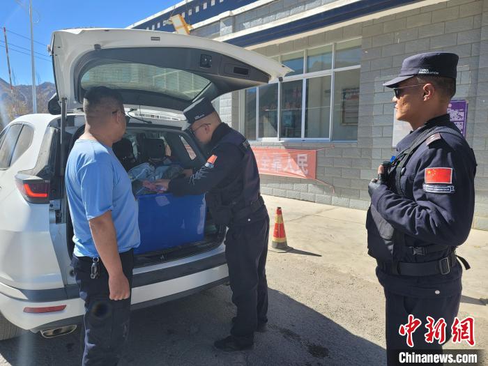 圖為西藏日喀則邊境管理支隊魯魯邊境檢查站民警對過往車輛及隨車人員進行檢查。魯魯邊境檢查站供圖