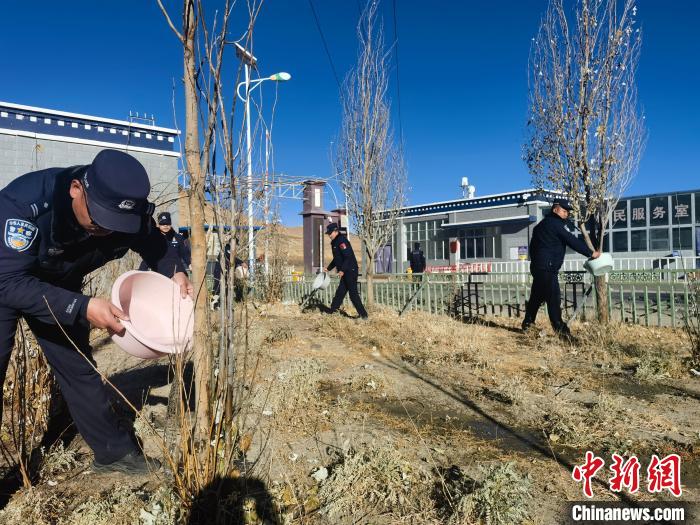 圖為魯魯邊境檢查站組織民警在營區(qū)周邊和查驗通道附近開展冬灌排水、施肥等綠化養(yǎng)護工作。魯魯邊境檢查站供圖