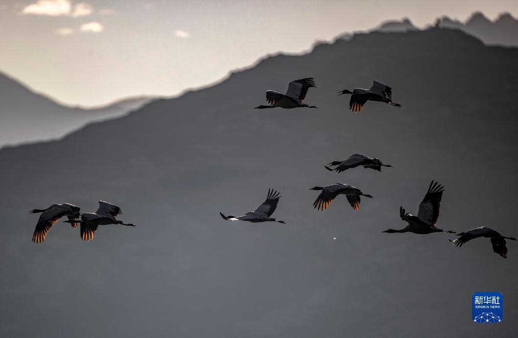 這是12月5日清晨在拉薩市林周縣虎頭山水庫拍攝的越冬黑頸鶴。新華社記者 姜帆 攝