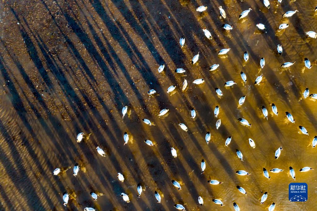 這是12月5日清晨在拉薩市林周縣虎頭山水庫拍攝的越冬黑頸鶴(無人機照片)。新華社記者 姜帆 攝