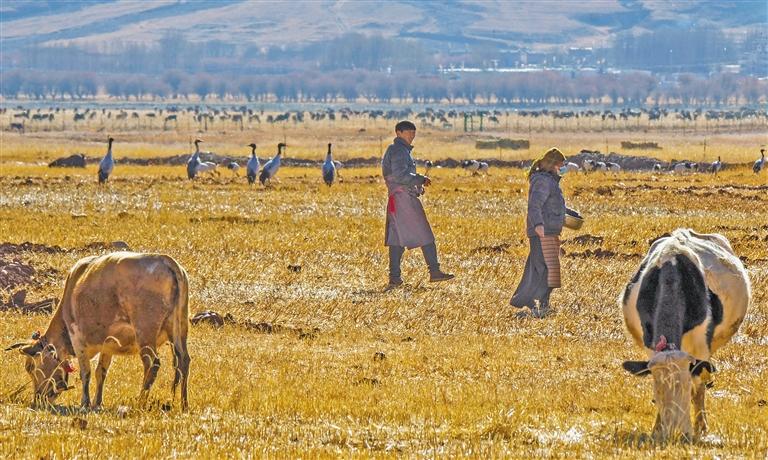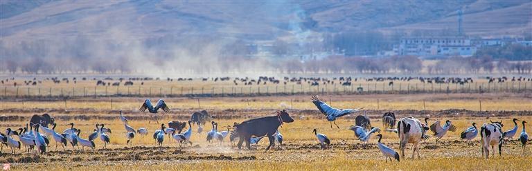 卡孜濕地是其中一個(gè)投食點(diǎn)?,F(xiàn)年43歲的洛桑次旦就住在附近,每天一大早,他都會(huì)到卡孜濕地放牧。“‘鄰居’越來(lái)越多了,十幾年的時(shí)間,黑頸鶴的數(shù)量從幾只增長(zhǎng)到幾百只?!甭迳4蔚└嬖V記者,黑頸鶴和牛各吃各的,互不干擾,非常和諧。