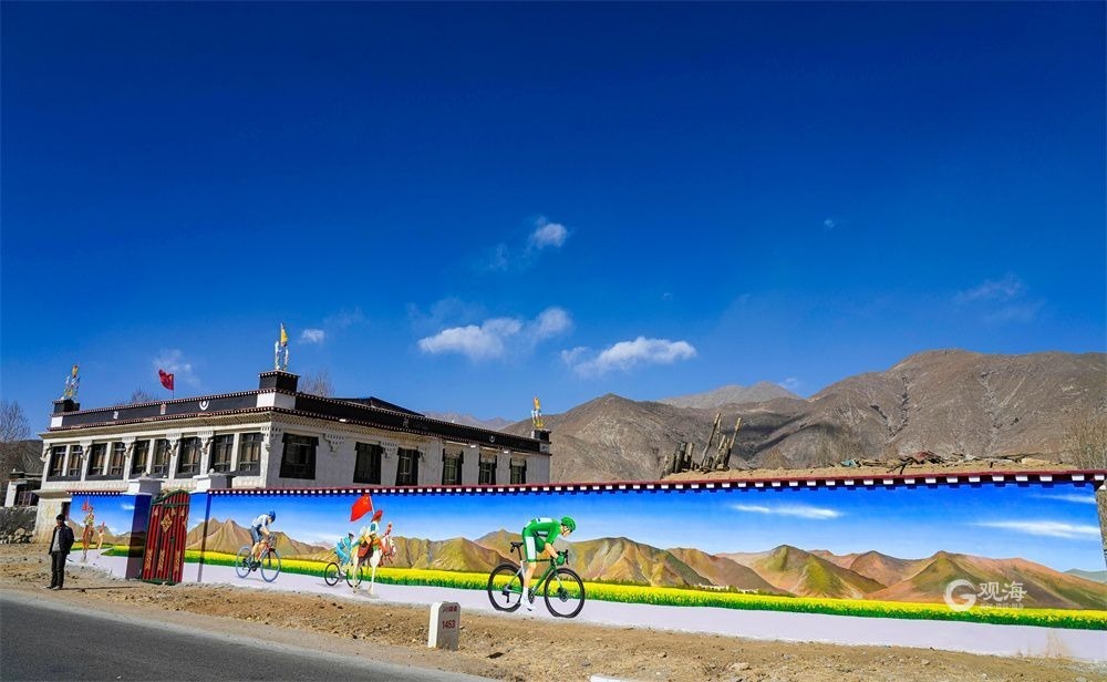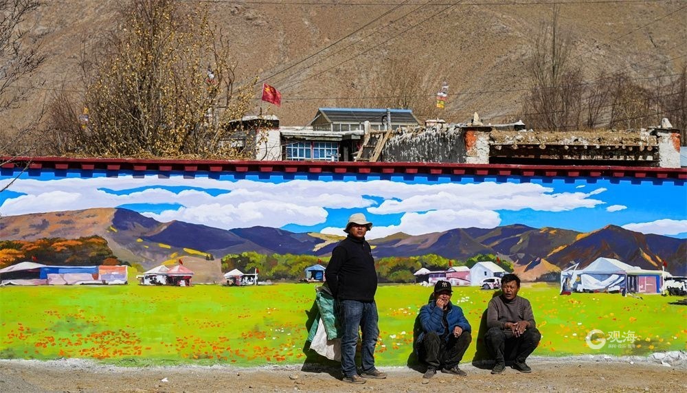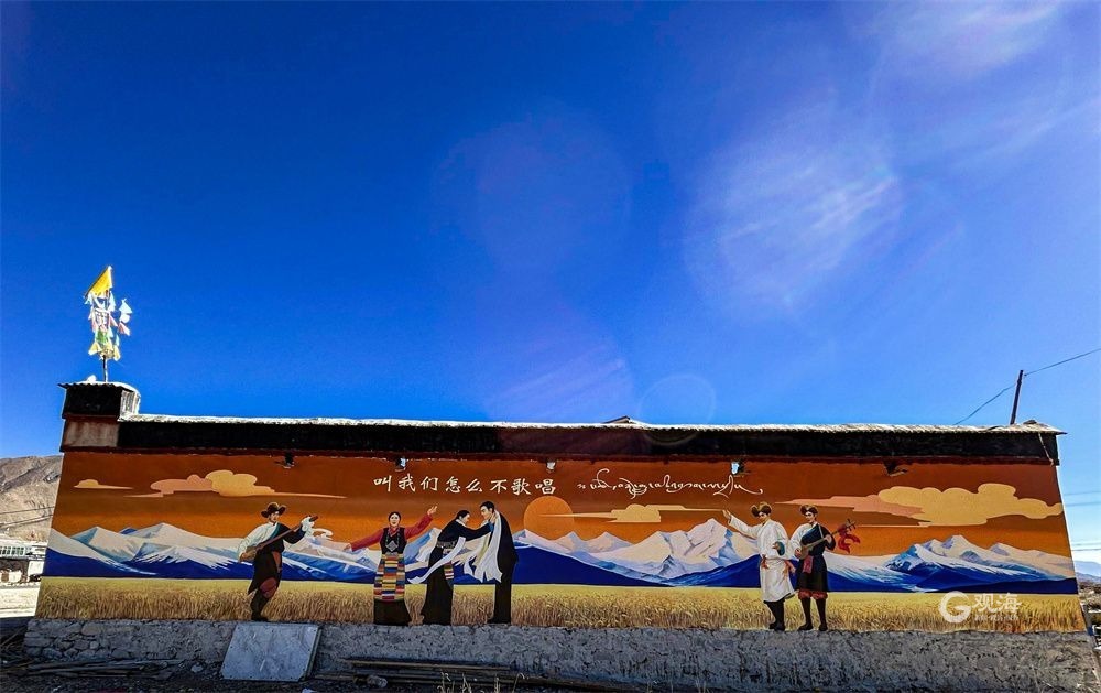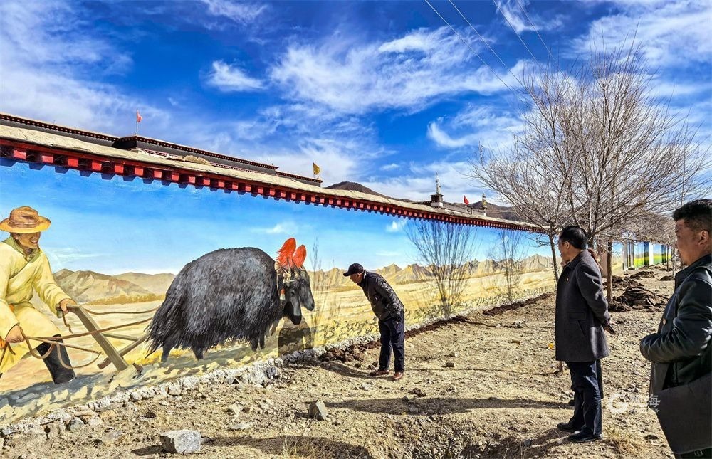 廣袤的高原上,在連綿起伏的山巒之下,是藏族農(nóng)家趕著傳統(tǒng)的“二牛抬杠”耕耘的場(chǎng)景,旁邊的“阿佳”則撒下希望的青稞種子……這樣的場(chǎng)景當(dāng)然不會(huì)出現(xiàn)在現(xiàn)在這個(gè)滴水成冰的季節(jié),而是躍然于藏家傳統(tǒng)村居的院墻之上?!拔壹疫@面墻原來就是貼滿了牛糞,現(xiàn)在畫上了我們平時(shí)勞動(dòng)的景象,感覺比之前更好看了。”桑珠孜區(qū)東嘎鄉(xiāng)色定村的村民旦瓊說,此前的一年又一年,他都是把牛糞貼在墻上,固然有傳統(tǒng)的高原美感,但是與現(xiàn)在院墻上畫的鄉(xiāng)村振興的場(chǎng)景相比,還是現(xiàn)在的感覺更不錯(cuò)。
