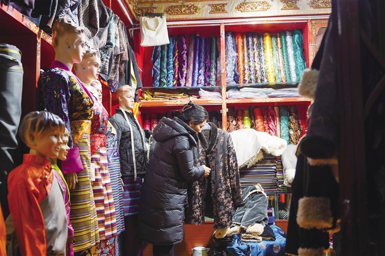 “最近來做冬款藏裝的人挺多的,大部分都是本地居民?!钡曛骷诮榻B,中老年人常穿的款式是無袖深色和單色的“特瑪”料子藏裝,年輕人則喜愛傳統(tǒng)和潮流兼?zhèn)涞牟匮b。同時(shí),隨著旅游業(yè)的發(fā)展和各民族文化交流加深,很多游客也開始購買藏裝,“以前游客都是春夏買藏裝,但是現(xiàn)在也有一些游客會買冬裝。”吉宗說,大多數(shù)游客一開始普遍喜愛花色眾多、顏色亮麗的綢緞料子,慢慢會比較偏向純色、傳統(tǒng)藏裝。