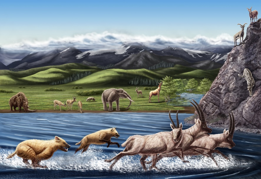 西藏札達(dá)盆地上新世哺乳動物群生態(tài)復(fù)原圖。(中國科學(xué)院古脊椎所供圖)