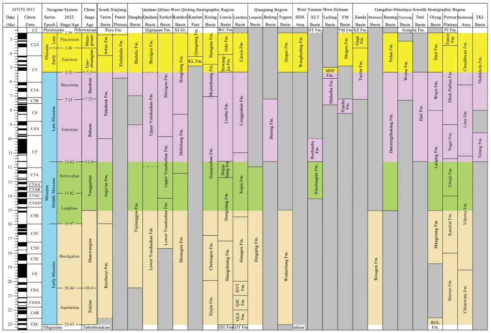 中國的新近紀(jì)年代地層系統(tǒng)分為中新統(tǒng)的謝家階、山旺階、通古爾階、灞河階、保德階5個(gè)階,以及上新統(tǒng)的高莊階和麻則溝階2個(gè)階。研究提出,在青藏高原新生代陸相地層的劃分對比和測年標(biāo)定上,哺乳動物化石起到非常重要的作用。