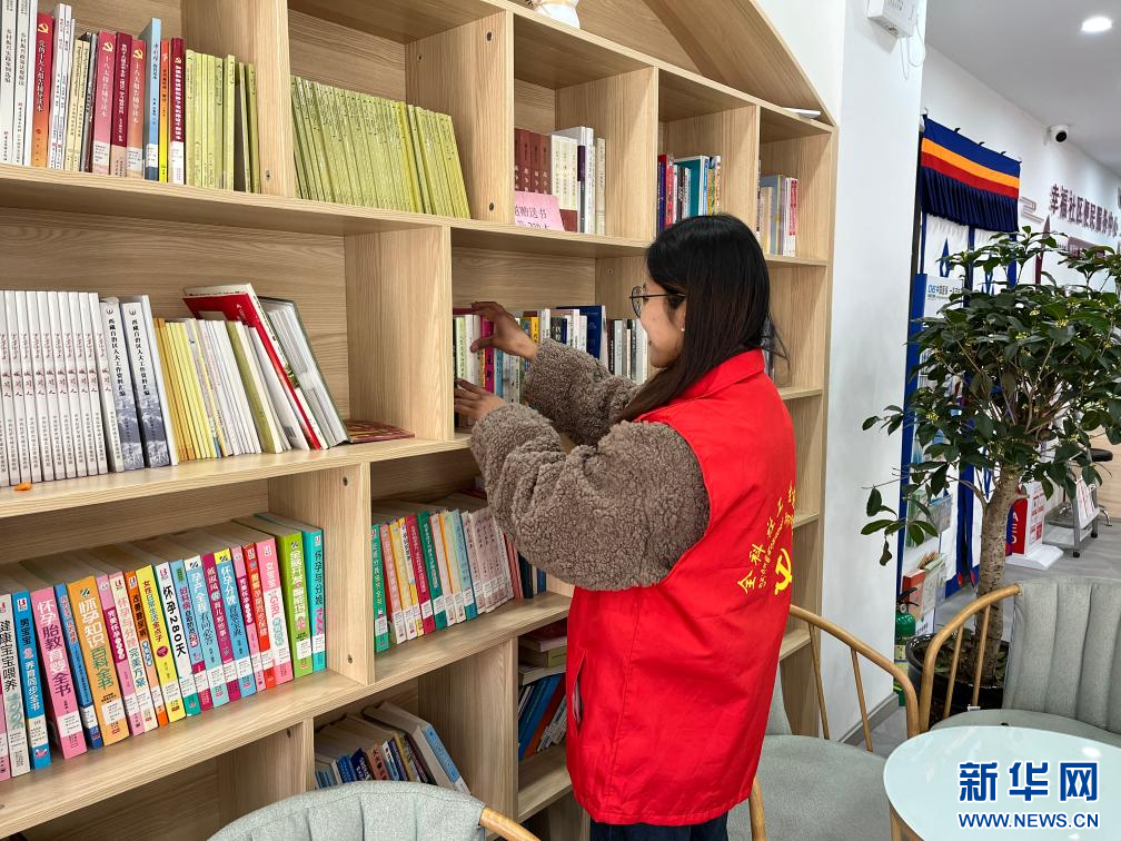在西藏拉薩市功德林街道,幸福社區(qū)的“全科社工”強珍正在整理黨群服務(wù)中心的書籍(11月26日攝)。新華社發(fā)(德央 攝)