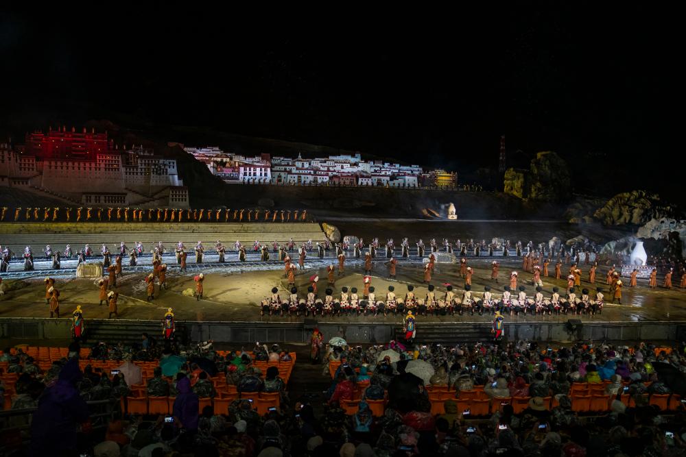 夜幕降臨,實景劇《文成公主》以現(xiàn)代歌舞劇藝術(shù)形式,講述當(dāng)年文成公主與松贊干布和親的歷史故事。大唐歌舞和藏戲的融合,舞臺藝術(shù)與自然山川的呼應(yīng),歷史人物與美好主題的展示,讓人領(lǐng)略不一樣的西藏文化。全劇有近800名演職人員。除專職演員外,很多藏族農(nóng)牧民參與演出,有效促進當(dāng)?shù)厝罕娋蜆I(yè)增收。