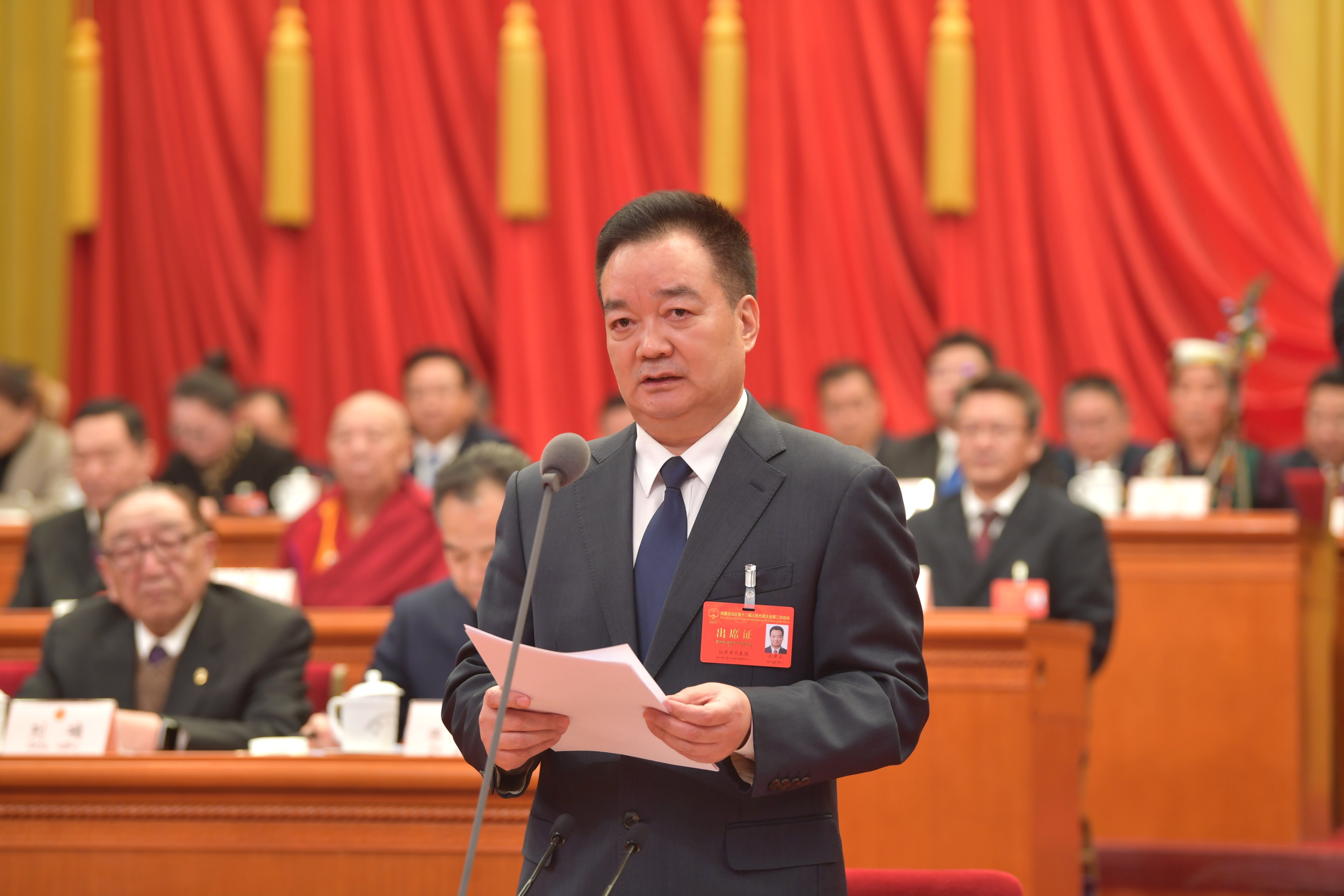 自治區(qū)人大常委會副主任旦科、堅參、桑頂·多吉帕姆·德慶曲珍、王峻、張延清、許成倉、江白、唐明英、劉柏呈、李文革、孫獻(xiàn)忠和秘書長劉光旭在主席臺前排就座。大會主席團(tuán)其他成員和自治區(qū)省軍級領(lǐng)導(dǎo)在主席臺就座。