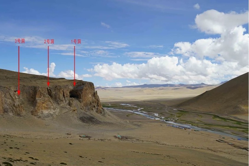 梅龍達普洞穴地處藏北羌塘高原西部地區(qū),位于革吉縣城南約30公里、獅泉河上游左岸的石灰?guī)r山體上,洞口位置高出獅泉河水平面104米。梅龍達普,藏語意為“腰間的鏡子”,由一字排開的三個獨立洞穴組成:一號洞規(guī)模宏大,面積超過1000平方米;二號洞規(guī)模較小,面積約60平方米;三號洞,規(guī)模最小,面積約25平方米。