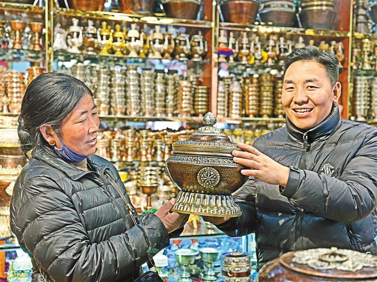 “大型的孔雀扇550元、中型450元……您看喜歡哪種。”2013年就在八廓商城做生意的德吉給顧客耐心地介紹著。
