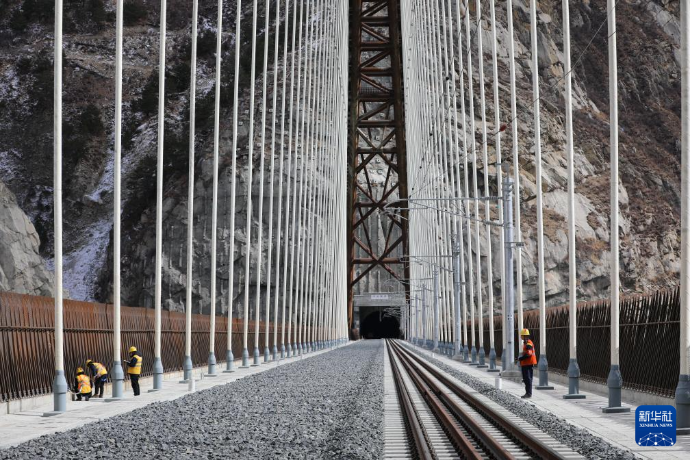加查橋隧工區(qū)副工長(zhǎng)張亮在檢查藏木特大橋螺絲銹蝕情況(1月27日攝)。新華社發(fā)(拉巴次仁攝)