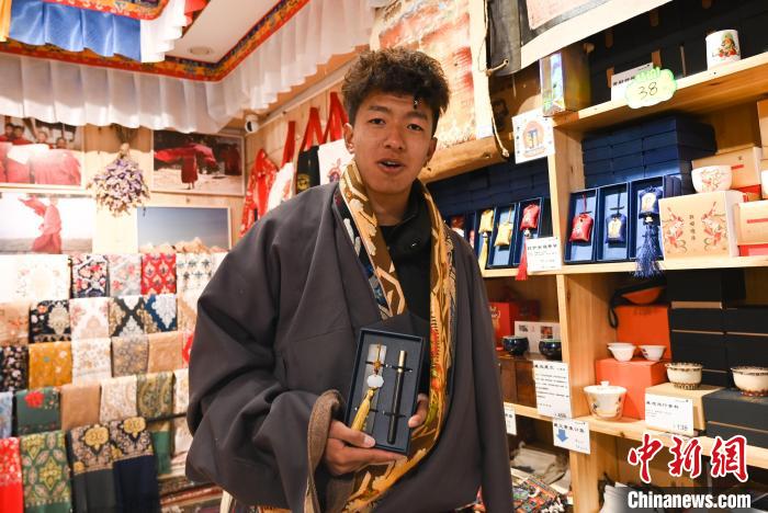 剛朝佛完的青科正和家人在店里挑選著文創(chuàng)產品,這位來自青海省果洛藏族自治州的年輕小伙,和家人來過拉薩很多次,但自駕來是首次。青科和哥哥挑選了很多文創(chuàng),其中有刻著藏文的鋼筆,“回去想送給我的老師”。