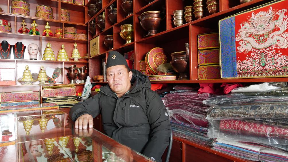 在普蘭縣唐嘎邊貿(mào)市場(chǎng)里經(jīng)商的尼泊爾籍商人米瑪(1月7日攝)。新華社記者陳尚才攝
