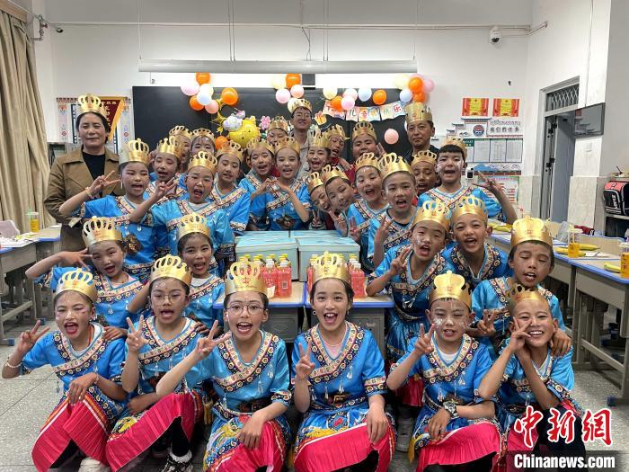 圖為襄陽市“格?;ā敝Ы虉F(tuán)老師陪瓊結(jié)鎮(zhèn)小學(xué)孩子們過集體生日。曲杰 供圖